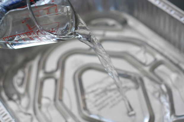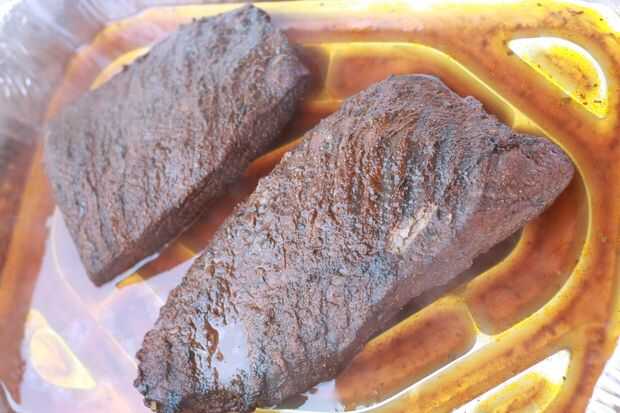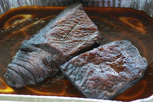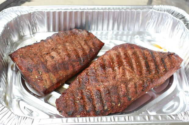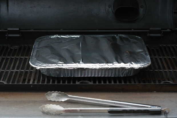 11:15 - vierta media taza de agua caliente en el recipiente desechable. Transferir la parte grasa de carne hasta la bandeja y cerrar la tapa para no perder calor. Cubrir la bandeja con papel de aluminio y volver a la parrilla. Cierre la tapa y mantenga una temperatura de 250-275 grados F para el resto del tiempo de cocción.