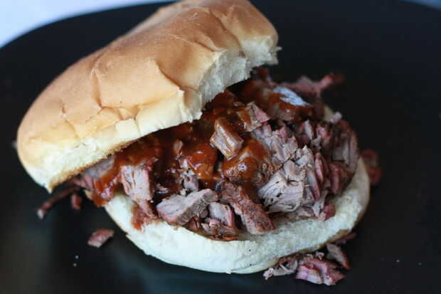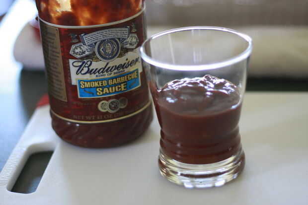 Mezclar un jugo de parte a una parte salsa de BBQ y mezclar bien. Verter sobre la carne o servir del lado como salsa que sumerge. Esta carne hace un sándwich de carne picada gran así.