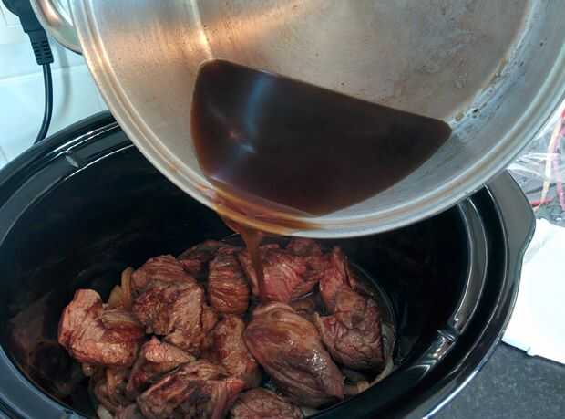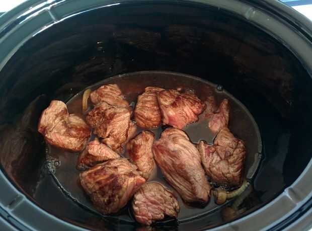 Tan pronto hierva, agregue a la carne y las cebollas en la olla de cocción lenta.