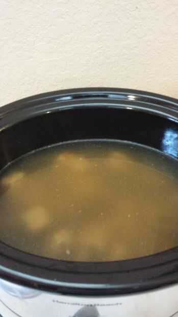 Dore el pavo molido sobre la parrilla eléctrica, corte la gran patty en losas más pequeñas antes de colocar en la parrilla. Una vez cocidos he desmenuzado la carne en la olla y agrega el caldo de pollo y el agua (aproximadamente 1 cuarto de galón).