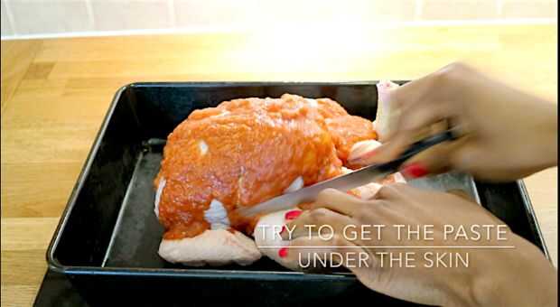 2. hacer unos cortes sobre el pollo e intentar conseguir como mucho adobo debajo de la piel. Envuelva el pollo en papel de aluminio papel de aluminio para mantener el pollo húmedas.