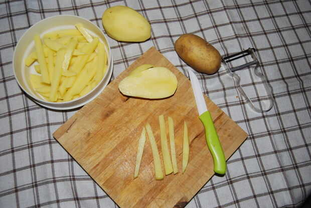 1. Cortar las patatas fritas, elige el grosor según su preferencia.