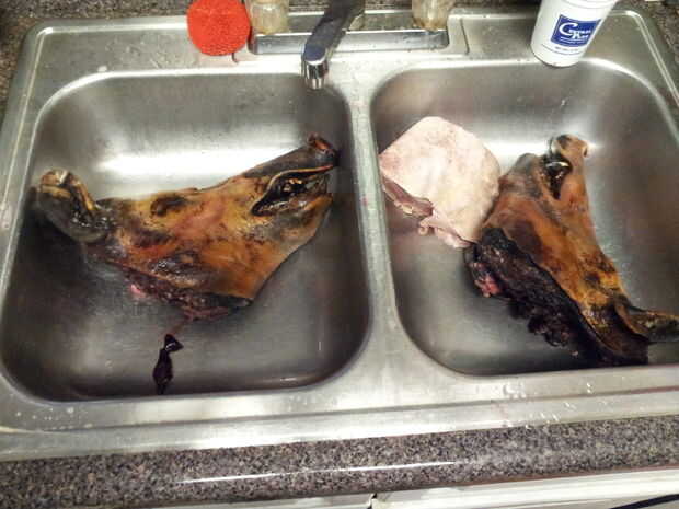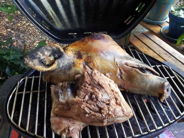 La cabeza es toda, así que lo tenía en el carnicero. Luego lanzó en una parrilla para obtener un sabor carbón y quemar cualquier pelo extra. Su mejor si el calor es alto sólo para obtener un color quemado y no cocinarlo.