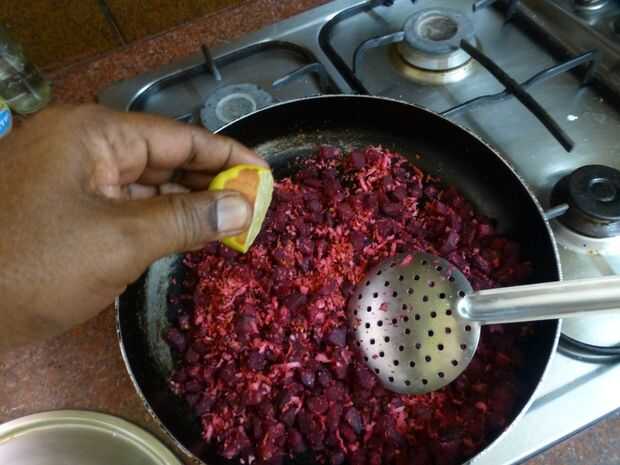• Cortar un limón o Lima por la mitad y rocíe el jugo sobre los cubitos de remolacha en la sartén.