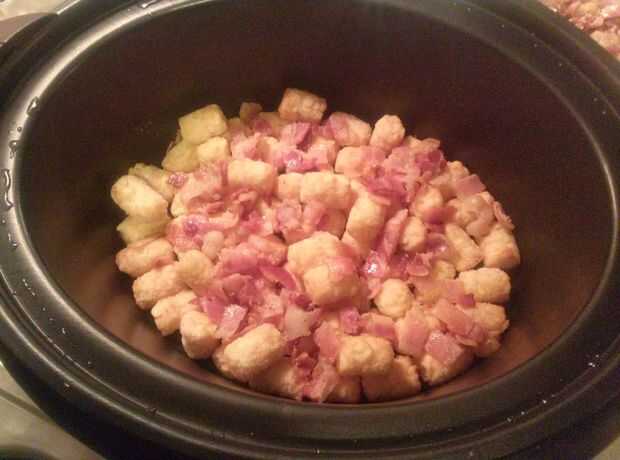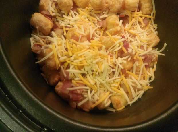 Empezar con una buena capa de tater tots (o hash browns) en la parte inferior.