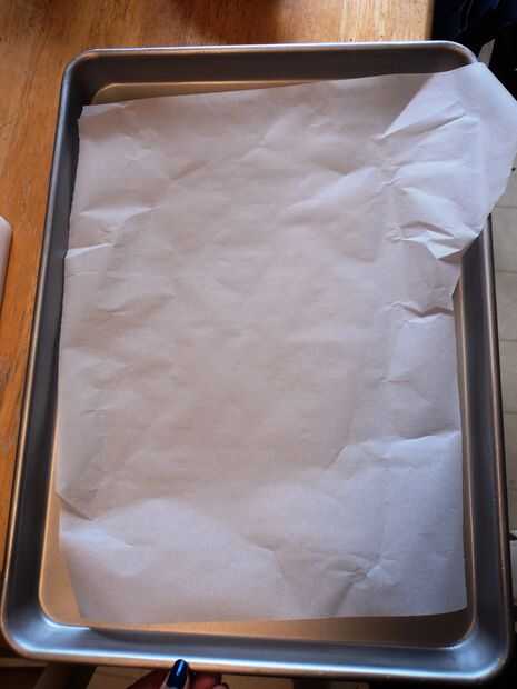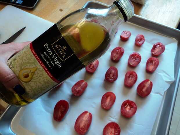 Cortar los tomates por la mitad y póngalos con algo de espacio en el medio en una placa para horno.  Cubrí mi placa para horno con papel sulfurizado para evitar que los tomates se peguen a la bandeja para hornear y facilitar la limpieza y definitivamente lo recomendaría!