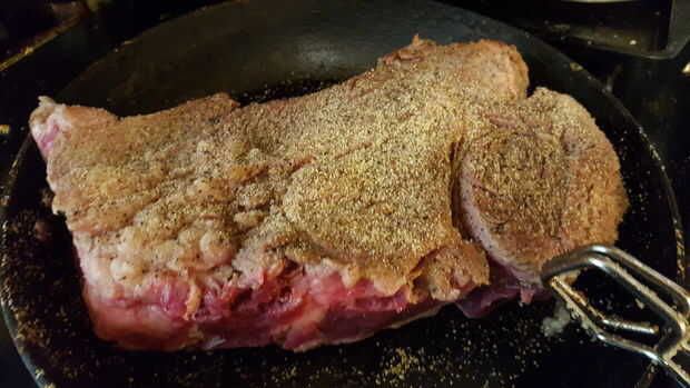 Espolvorear una capa de sal, pimienta y ajo en polvo para cubrir la superficie de la carne. Después de 2 minutos, darle la vuelta y repetir la aspersión de condimento.