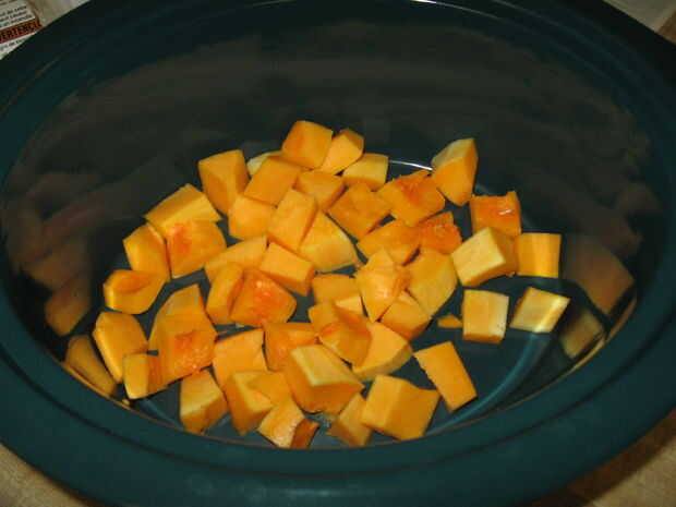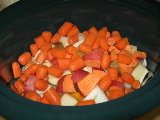 Ya que vas a cocinar esto mucho tiempo, no quiero tus piezas a ser demasiado pequeño. Sean un poco en el lado blando cuando se hacen, y si se cortan los pedazos minúsculos tienes tiempo diciendo lo que está comiendo (aunque si te gusta eso, entonces ¡ adelante!). Las verduras más duras, como calabaza, pueden ser en piezas ligeramente más pequeñas que las verduras más suaves, como las zanahorias.