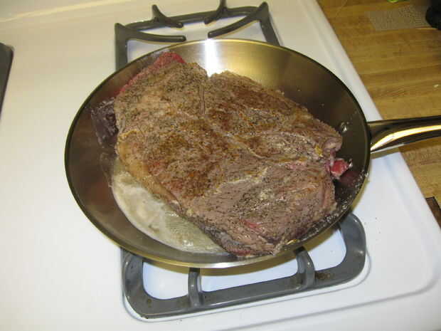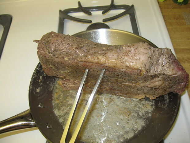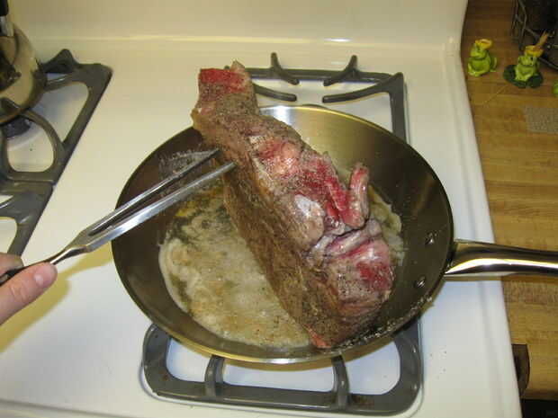 Con cuidado (porque es muy probable que salpicar un poco), colocar el asado en la sartén. Deja durante 3 minutos y luego voltee hacia el otro lado. Cocine de ese lado durante 4 minutos (más tiempo porque la sartén será más fresca de lo que fue la primera parte). Finalmente, consigue todos los lados pequeños de aproximadamente un minuto cada uno. Probablemente tienes que apuntalar el asado para hacer esto.