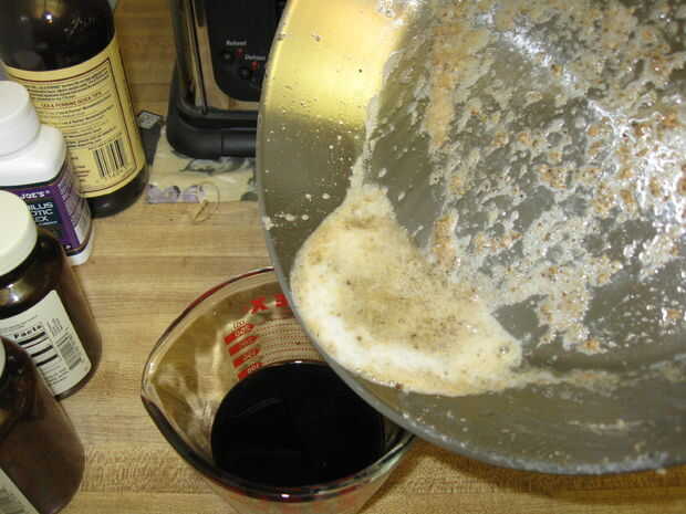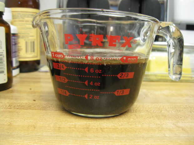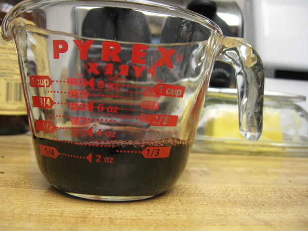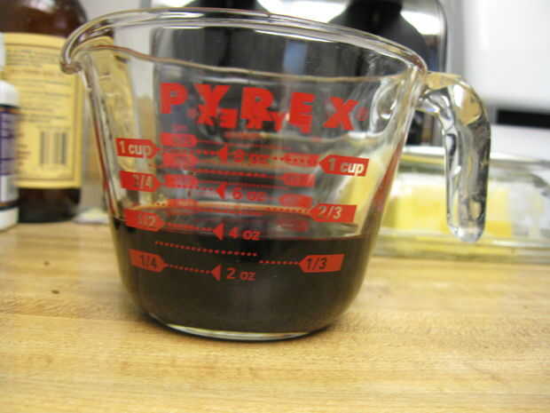 Añadir vino Merlot de 1/4 taza (2 onzas), 1/8 taza de vinagre balsámico (1 onza), 1/8 taza de salsa Worcestershire (1 onza), la grasa de la sartén el la carne en la plancha, y suficiente agua para hacer 1 taza del líquido. Sé que esto no parecer mucho, pero créeme es mucho!