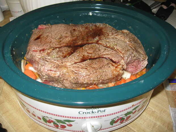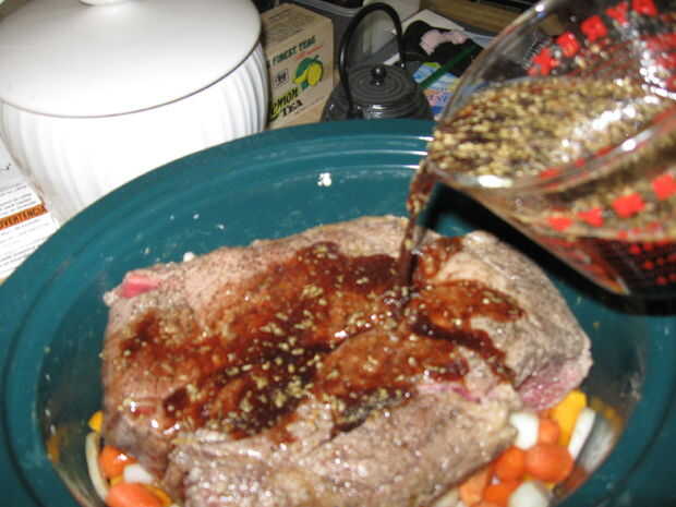 Ahora, vierta el líquido sobre la carne. Naturalmente se derrame fuera en las verduras, pero esperemos que si eche el agua lentamente y su asado es plana, algunos permanece en la carne.