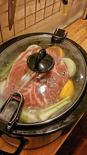Llenar hasta el borde con agua y cubierta. Con todos los ingredientes dentro, tomó alrededor de seis tazas de agua para llenar mi olla de cocción lenta.