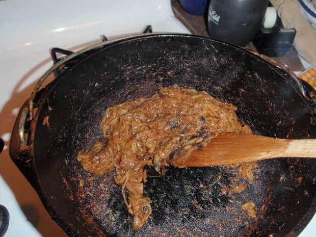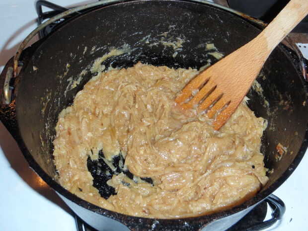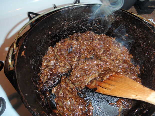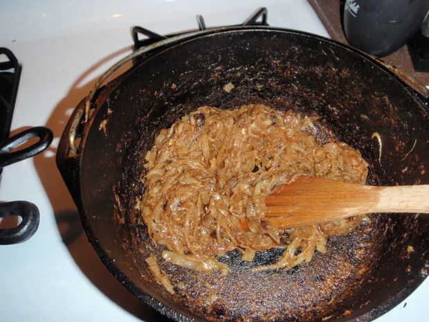 En este punto es que tirar el bote y ponerlo en la estufa a fuego medio. Las cebollas son menos húmedas, pero un montón de humedad todavía está en la olla y quiere salga. Resista la tentación de arrancar el calor y les permita carmelize lentamente. Busca un color caoba profundo.