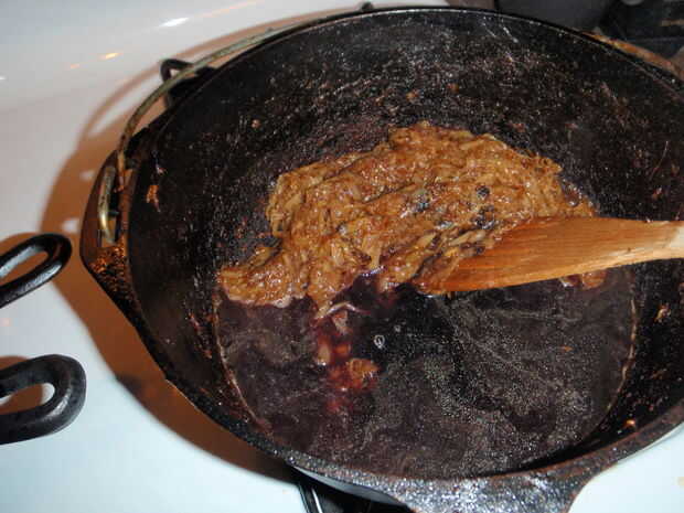 También tendrás unas cebollas "captura" en la parte inferior de la olla. Eso está bien. Después de que hayas llegado a esa perfecta del color, es tiempo para Desglasar.