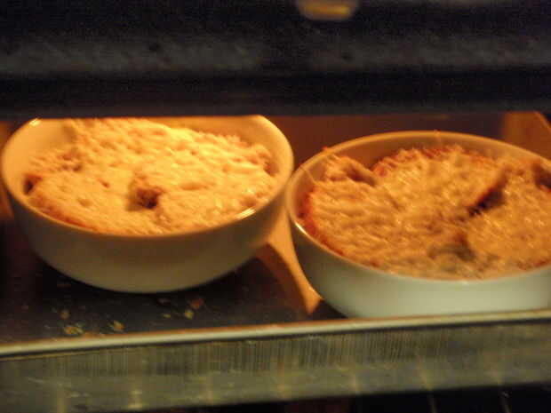 Una vez que la sopa se calienta cuidadosamente vierte hacia fuera en sus cántaros. Deje una pequeña sala en la parte superior por lo que puede flotar los picatostes en la parte superior. Me gustaría arreglar el pan así que no hay mucho espacio a la izquierda para sopa a ver. Esto es cuando a esparcir su queso fantasía que yo soy muy celoso de toda la parte superior. Yo le Espolvoree mi mozzarella del saco en él.