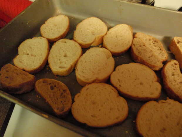 Tomar su baguette y cortar en... rodajas supongo. Sesión para 3/4 en rebanadas o 2 cm (y sé que no es una conversión correcta). Si eres sabio, harás este ayer cuando hiciste la sopa. Pero el paso aquí porque usted querrá dar las rodajas un poco tostado tostado. Si tienes un horno de la tostadora, es fácil como puede ser. De lo contrario, ponerlos en una bandeja para hornear y tostar en el horno a 350. Si usted cortado ayer, tu pan estará un poco duro por lo que se trata de un proceso más rápido. Yo sólo tostado un lado, pero usted puede hacer lo que quiera. Una vez fuera del horno las rodajas, en el asador y uno de los estantes de aproximadamente 6 pulgadas de él (esto también es una aplicación de horno de tostadora buena).