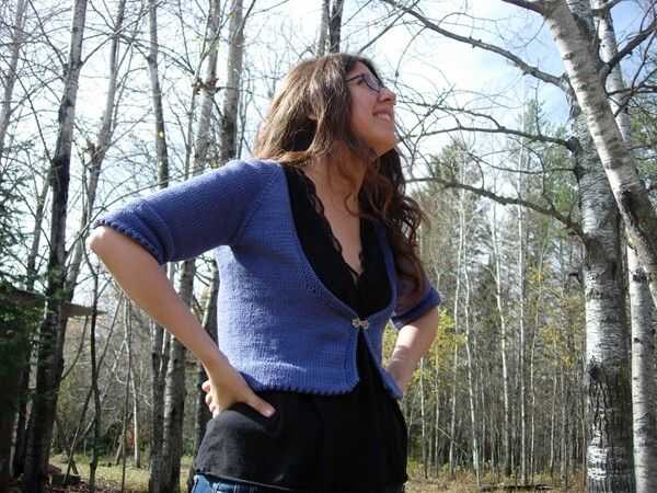 Equipado teje y como un patrón en Knitty. El hilo que utilicé fue algodón facilidad de la marca del León, una mezcla de acrílico algodón delicioso de la bondad de vegan. Usé sólo bajo cuatro madejas de colorway violeta. Los únicos cambios que hice al patrón fueron que hice las sisas un poco más grande y usé un cierre comprado en vez de los vínculos de la hoja.