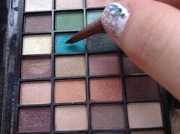 Sorteo a lo largo de la línea de flotación con sombra de ojos o lápiz de ojos brillantes y vivos. Yo soy este tutorial, he usado un verde azulado brillante.