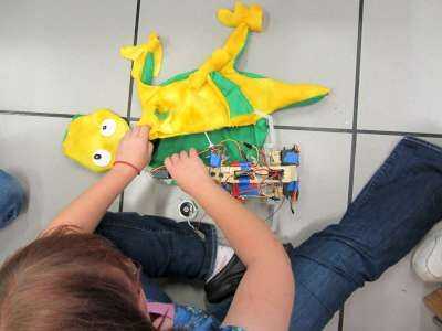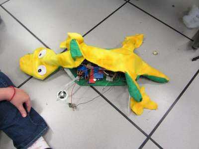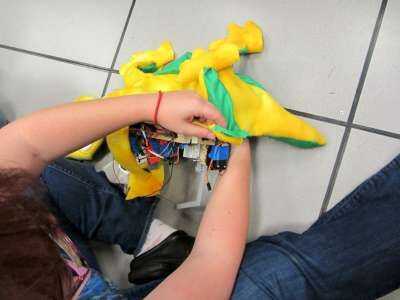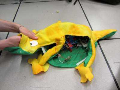 Aquí viene la parte realmente difícil primera Ponga suavemente las dos patas restantes de esqueleto en sus correspondientes agujeros de la pierna antes de insertar el procesador arduino y protoboard en el lagarto.
