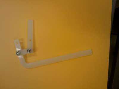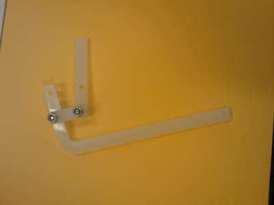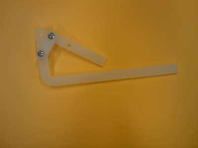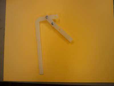 Pulse un cuerno del servo en un servo pequeño y poner el servo a través del orificio en el lado del soporte para que la bocina está en el centro del soporte. Enderece un clip pequeño y pasar un extremo de la misma a través de un agujero cerca del final del cuerno del servo y doblar en lugar. doble un ángulo de 90 grados en el clip de 20 mm por encima del cuerno del servo y recortar unos 10mm después de la curva. Introduzca este extremo de la presilla a través del pequeño orificio en el extremo de la larga vinculación y doblar en lugar. Haciendo girar el servo, ahora debe ser capaz de subir y bajar la pierna.
