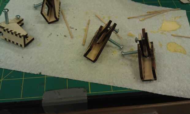 Pegamento la los lados del soporte en la base forma el loints dedo cortado en los bordes. Pegar los vínculos madera pequeño dos restantes en el interior las paredes del soporte. El orificio más grande debe ser hacia la parte inferior del soporte y alinee con el agujero en la pared lateral. Los vínculos deben alinearse con la cara plana en la parte superior del flanco. Poner un perno o pasador a través de ambos agujeros de acoplamiento como secado de pegamento ayudará a alineación más tarde. Establecer este montaje a un lado para secar.