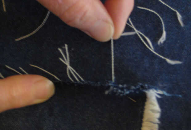Punto de aprendizaje: "Cuadrado de la tela" no se refiere a cortar a la tela en un cuadrado perfecto. Es el proceso de tirar hilos corta desde el borde de corte (deshilachado) de la tela, lado a lado, hasta que pueda salir un hilo de rosca que es igual a la anchura total de la tela. Recortar el borde deshilachado.