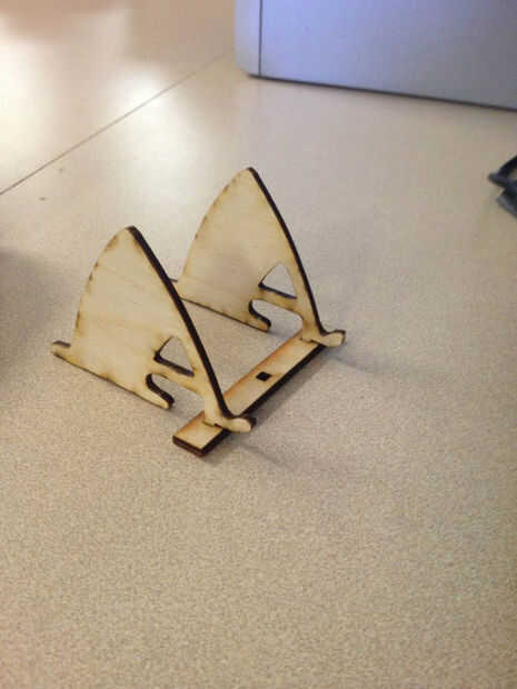 Al principio que mi plan era una pieza rectangular con las esquinas difíciles y una tercera ranura en el medio hasta el espacio entre la A podría ser ajustable. Más tarde decidí que si simplemente pasé los dos fuera de las ranuras más cerca juntos pude remover el medio y todavía ser capaz de sostener mi teléfono en ambas posiciones. También decidieron las esquinas duras para una mirada mucho menos rígida de la curva. Yo entonces laser grabado al agua fuerte mi nombre entre las ranuras para mayor personalización.