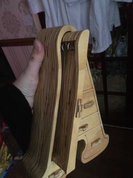En una caja como la letra A donde la izquierda no es lo suficientemente grande como para hacer un cajón me cortar formas largo y añadido algún tornillo en ganchos para colgar collares o pulseras.