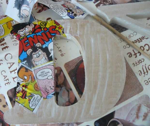 Si usas papel de peso ligero o mediano, como el papel cómico en este ejemplo, es más fácil de cortar o rasgar el papel en cuadrados de tamaños diferentes y colocar éstos en toda la carta frente y parte posterior, superposición de los lados. Cuando la parte delantera y trasera han sido cubiertos Coloque tiras estrechas para cubrir cualquier orificio restante en los lados. Un papel más grueso no funciona bien con esta técnica por el grosor del papel donde se superpone.
