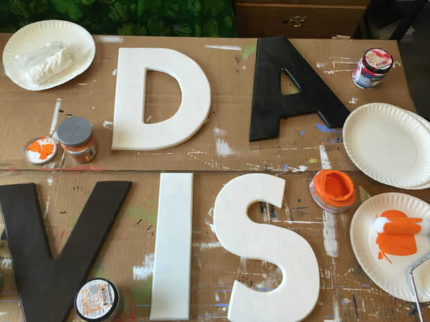 Letra de pintura el color base necesario, tan naranja para el baloncesto, negro para aro de baloncesto, marrón para el fútbol, blanco para el béisbol, etc.. Probablemente necesitarás al menos dos capas, tal vez tres. Yo uso un rodillo pequeño de 4" para puertas/gabinetes en la mía, pero una cuña de espuma o pincel de pintura le funciona tan bien. Permiten secar bien antes de agregar las plantillas.