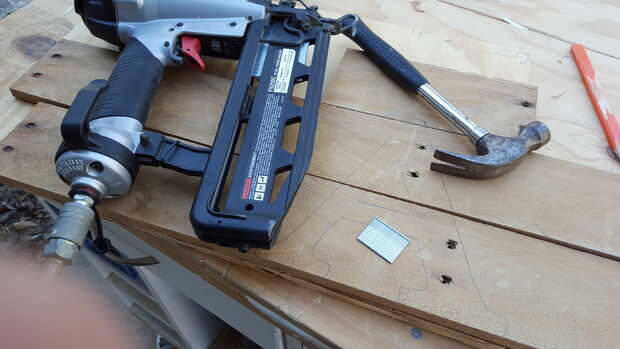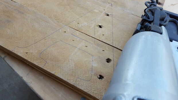 utilizando martillo y clavos, una pistola de clavos o tornillos fijar piezas palet madera contrachapada Asegúrese de contorno se alinea correctamente.