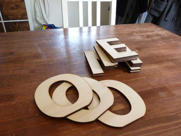 3. yo quería hacer mis letras autoportante, por esta razón recortar tres de cada letra de capas de espesor 6 mm con 14 cm niño de Sassoon (que es la fuente que ahora se utilizan en las escuelas primarias y tiene un agradable fondo plano excepto el oh que retocado). Usted necesitará conseguir su letras en mayúsculas lo no soporte.
