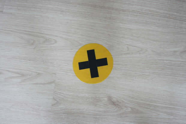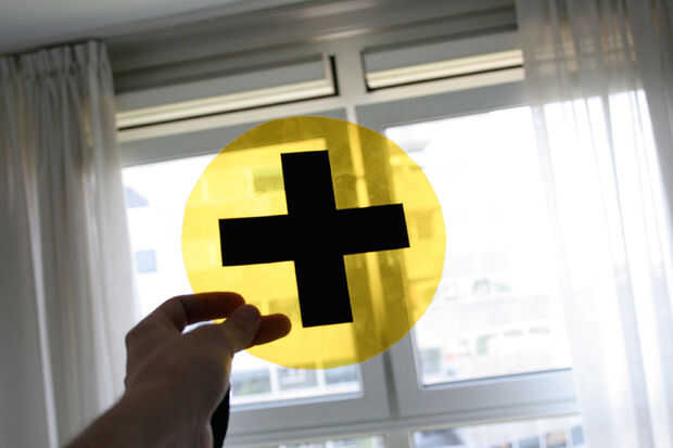 Tomar cuatro piezas de eqal de cinta negra. En cada uno de los círculos de que corte de plástico transparente amarillo, haces una cruz con la cinta. Asegúrese de pegar la Cruz en el media causa queremos que la muestra a ser simétrico.