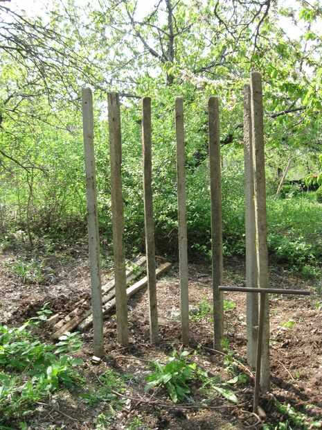 He conseguido algunas estacas de viñedo viejo, erigido en el suelo y apretado ellos juntos. Estos son que las paredes de la letrina. Usted podría utilizar madera o nada conveniente.
