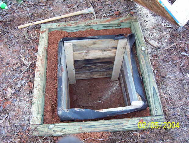 Ya tienes el agujero. Deje caer una caja de madera con alquitranado envuelto alrededor de él en el agujero para mantener la humedad hacia fuera. Nivel y nivelar el suelo alrededor del agujero y colocar una base de camionetas 4 x 4 tratada alrededor de él. La Fundación será para éste era de 4'x 3.5 ' (esto permitió una hoja 4 x 8 de madera contrachapada para cortarse a 3.5 pies, una sola pieza para el suelo y el otro para el techo con un ala. 4' de ancho en el piso y 4' de profundidad para el techo).