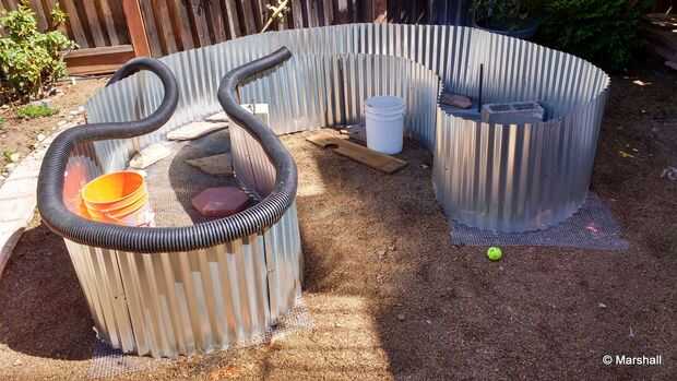 Si te fijas bien en la foto a ver picos de metal corrugado cada pocos pies, particularmente en las secciones más rectas. Éstos apoyan las paredes. Durante la construcción también utilizamos baldes con rocas o con agua en ellas para peso para soportar las paredes.