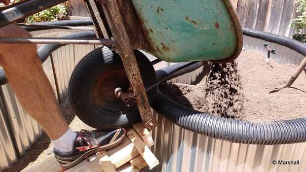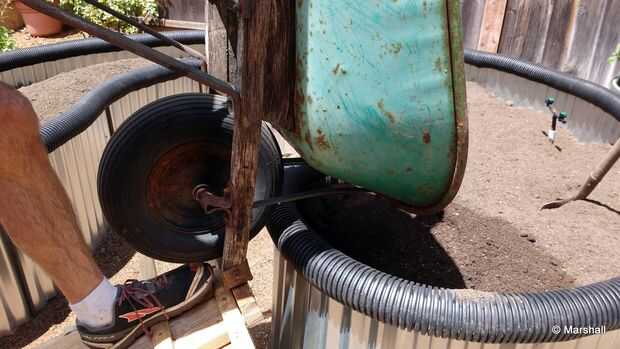 Algunos elevación extra fue necesario para levantar la madriguera de la rueda sobre el borde de la cama levantada y gire lo suficientemente vertical para el último de la tierra para derramarse.