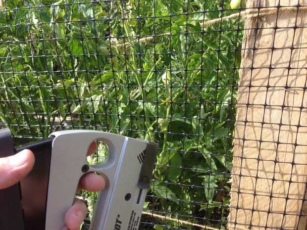 • Foto 12 - 7 de agosto. Envolvimos los montantes con cuerda de cáñamo para dar el soporte de las plantas. Los tomates se están poniendo pesados.