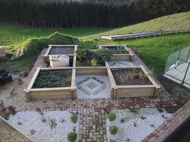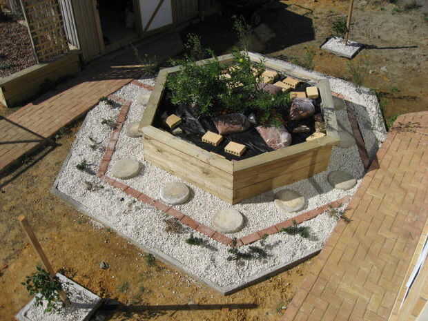 Finalmente terminó la parte superior con 6 x 2 por su parte, lap articulado en los cruces y esquinas, para actuar como un /perch del asiento y rellenos los huecos con adoquines y chip
