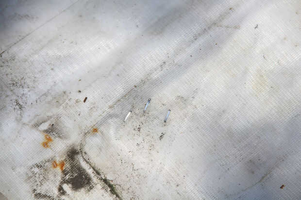 Usé un remanente de una lona que apareció en el Instructable otro mío. He cortado a la medida y grapas en su lugar. También fue a través con un punzón y poked unos agujeros de drenaje donde estaban los huecos en la madera.