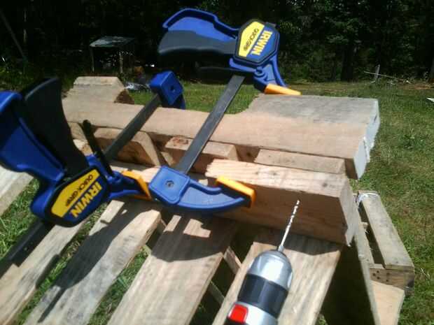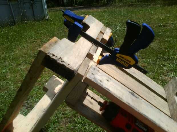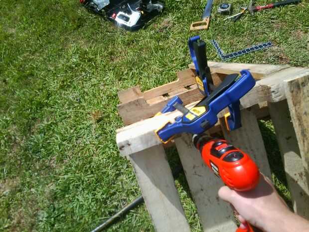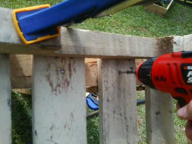 Asegúrese de que construir con mitades de plataforma de la misma plataforma situada frente a la unos a otros, como se muestra en el diseño. Por lo tanto, cada esquina tiene la mitad de una plataforma conectada a la mitad de la otra paleta; pero no de dos mitades de la misma plataforma Junta. Esto asegurará la mejor simetría y rectitud. No será perfecta, pase lo que pase, pero esto le dará el mejor resultado. Coloque las dos mitades juntas libremente con abrazaderas, aprovechar lo cuadrado y enrasabilidad y luego fije con abrazaderas firmemente para perforar los orificios piloto. Cuando colocar los extremos de las paletas de media que no tienen los listones de la parte inferior (la parte que solía ser el centro), asegúrese de permitir el grosor del listón que falta. Como veremos más adelante, yo no estaba prestando atención y había atornillado una sección juntos fuera de la Plaza y tuvo que volver atrás y arreglar. La primera vez que hice uno de estos, sólo utilicé 8 tornillos (2 por cada esquina), ya es todo lo que tenía, pero para este proyecto usé 4 para cada esquina. La parte superior de cada esquina (donde todavía se une el listón de fondo), taladre los orificios piloto dentro de una plataforma y en el otro, ya es la forma más fácil de sujetar. Para los puntos de fijación, utilizar el método óptimo de perforación y de fijación a través de los listones y en el corredor de la grueso.