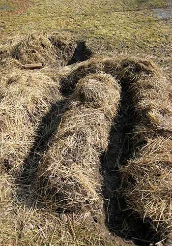 1) crea un montículo arcilloso suave, de alto a planta en que es capas de heno y el suelo excavado de zanjas.