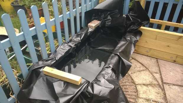 Esta es la última oportunidad para asegurarse de que no hay objetos cortantes por dentro de la charca de sí mismo, y en el piso debajo de donde va a ser el estanque en sí mismo, que potencialmente podría perforar el forro del estanque. Porque había situado mi estanque en un patio un poco accidentado, pongo cuadrados de alfombra vieja para cubrir el patio expuesto para ayudar más a prevenir cualquier piedras pinchar el forro (ver primera foto).