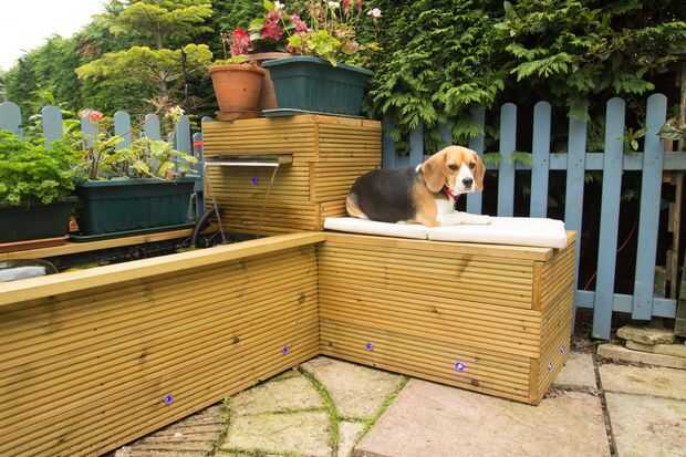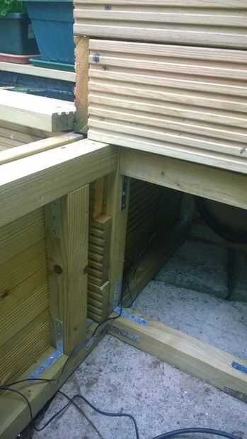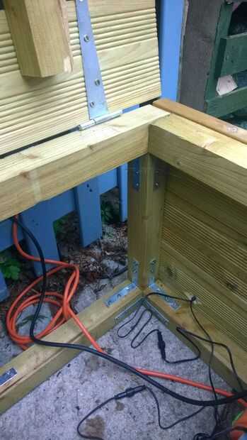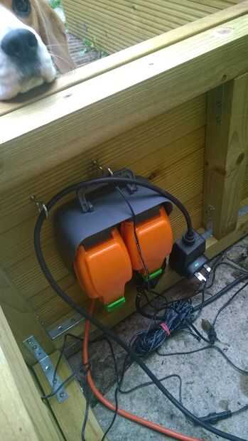 Para proporcionar energía a la bomba y luces, he instalado un enchufe doble externo justo debajo del asiento, colgándose de la parte interior de la estructura mediante ganchos de copa. Asegúrese de que su bomba / filtro etc. está conectado a un interruptor de circuito de algún tipo, por ejemplo enchufado el cable de alimentación externo un RCD en un socket en el interior. El asiento con bisagras bien esconde la fuente de alimentación, sin embargo, permite un acceso muy fácil.