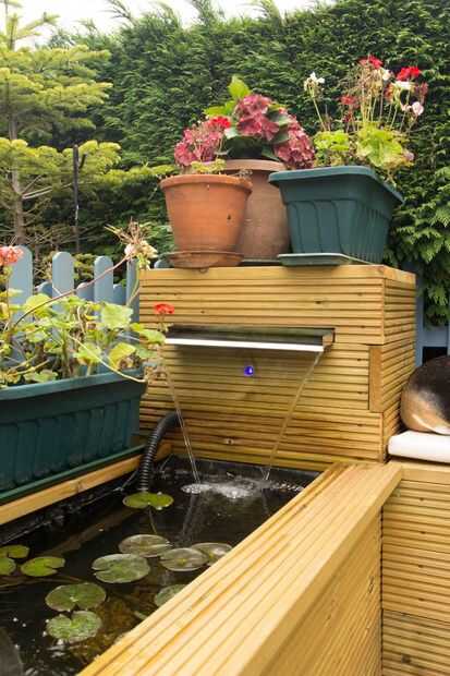 Para añadir más interés a la charca, compró un nenúfar en maceta y una planta de ' barrotes la cola de caballo' y colocar macetas en la cima de la torre de la cascada y alrededor del borde posterior del estanque.