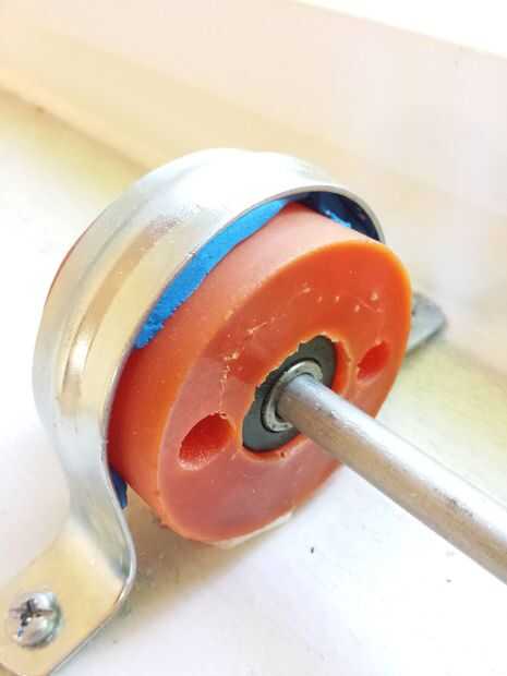 Mina su garaje para esas ruedas de skate vieja que no necesita más. Es un cojinete fino con un enfrentamiento de caucho que es el mismo tamaño que el diámetro del mandril de taladro. Instale un pies de largo 1/4" de diámetro de acero o de aluminio barra de la aleación en el mandril del taladro y el cojinete del patín y perno de la rueda de patín en el alféizar de la ventana como hiciste el motor, usando Sugru para sujetar firmemente en el soporte. La varilla debe estar nivelada. No use tubería. Va la hebilla. Barra sólida del uso.