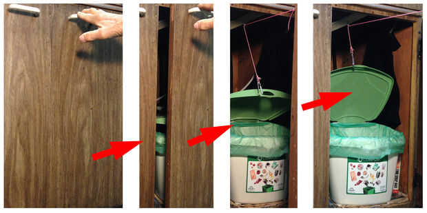 Introducción: Nuestra ciudad ha presentado recientemente un nuevo programa para compostar los restos de comida. Para ahorrar viajes fuera en el contenedor de compost banqueta grande, la ciudad distribuidos pequeños contenedores con tapas con bisagras a colocar en la cocina. Muchos residentes han señalado que incluso este pequeño bin toma espacio considerable, y que a menudo es difícil mantener la tapa abierta y vaciar los restos. Hemos resuelto estos dos problemas por colocar el cubo detrás de una puerta debajo del fregadero y la elaboración de un automático, mecanismo de baja tecnología, apertura de la tapa.