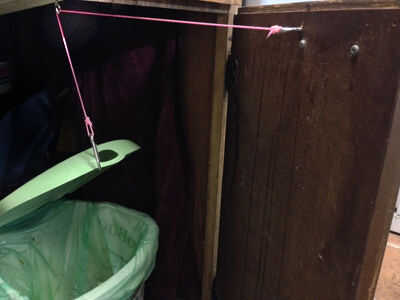 Sujete el extremo libre de la cuerda contra el interior de la puerta mientras abriendo y cerrando la puerta para determinar la duración óptima de la cadena y la posición para el segundo gancho de ojo. La tapa debe poder abrir completamente y cerrar completamente. Instale el segundo gancho de ojo y ate la cuerda a él. Vuelva a colocar los ganchos bin o vista como sea necesario para el funcionamiento más suave.
