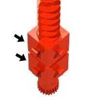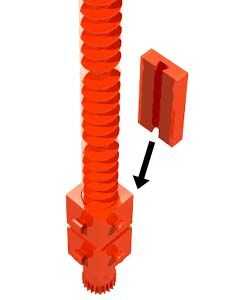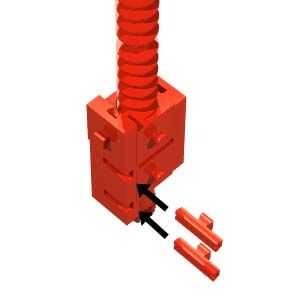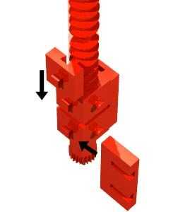 Fijar una tuerca de eje y un trabajo de fijación cerca de un extremo de un Clip eje 180. Añadir cuatro engranajes de gusano en el árbol. Añadir dos tuercas de gusano al conjunto de engranaje de gusano. Conecte las dos tuercas de gusano con un bloque de construcción 15 x 30 x 5 con ranura y Pin. Complete el montaje central con un bloque de edificio 5, edificio placa 15 x 30 x 5 con 3 surcos, tres camaras de primavera, un bloque de edificio 15 y dos bloque 7.5s.