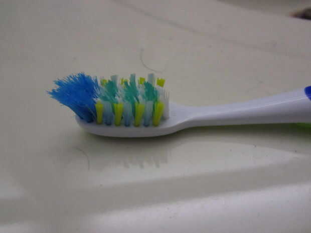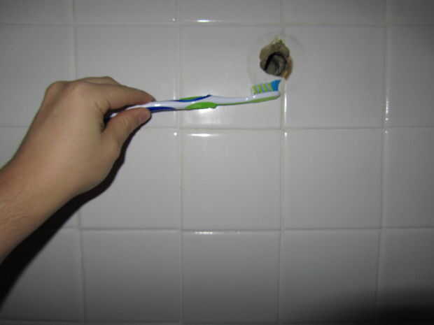 Ahora que has sacado el viejo pezón, habrá algunos restos cinta de teflón y tal vez algunos pedacitos crujientes no identificados en la hembra de tubería en la pared de la ducha. Use su cepillo de dientes (viejo bruto, ya no en uso) para quitar lo que pueda.